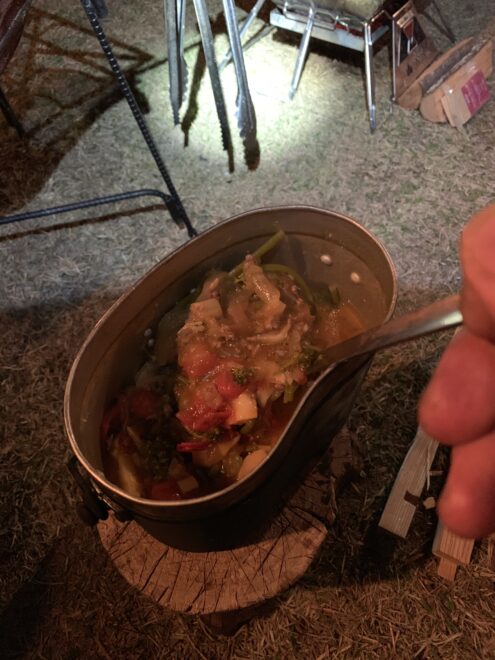 そして飯盒でスープなどの汁物を作って、肉を焼いたり、お約束のアヒージョを作るといった感じです。