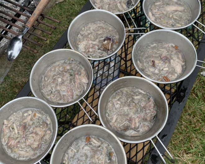 夕方から仕込んで焚き火で鍋底が当たらないようにひたすら煮込みました。