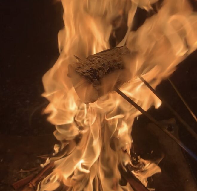 本当は、炭火の中に鶏油や食用油を入れて火柱を揚げるのですが、焚き火の火柱でもそれなりに煤はつくのであまり問題はありません。