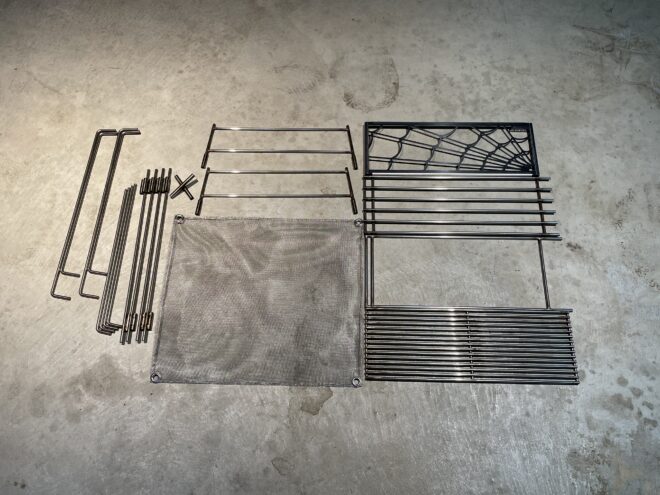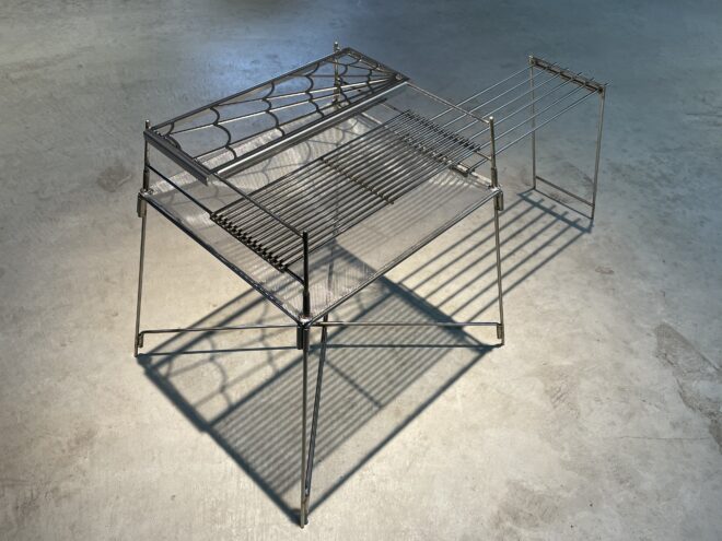 私が考案し製作する焚き火台は基本的に火床はメッシュで、その火床を4本の脚で支える構造です。
