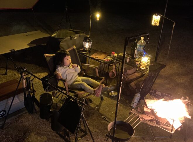 先日キャンプデビューした3ヶ月半の息子も焚き火に見入っていました。