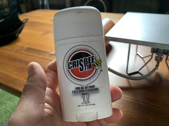 洗い終わり熱したスキレット、ダッチオーブンなど鉄製の調理器具に、ひと塗りしてあとは全体に伸ばしながら拭き取るだけです。