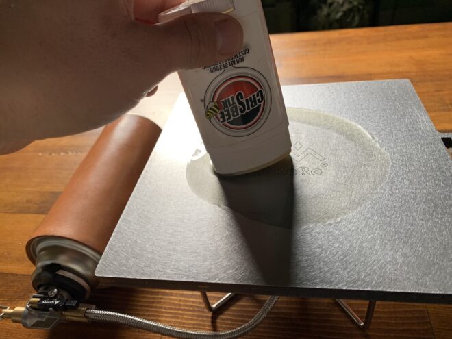 鉄板の真ん中に少量のクリスビースティックを当ててやればすぐに溶けて馴染もうとします。