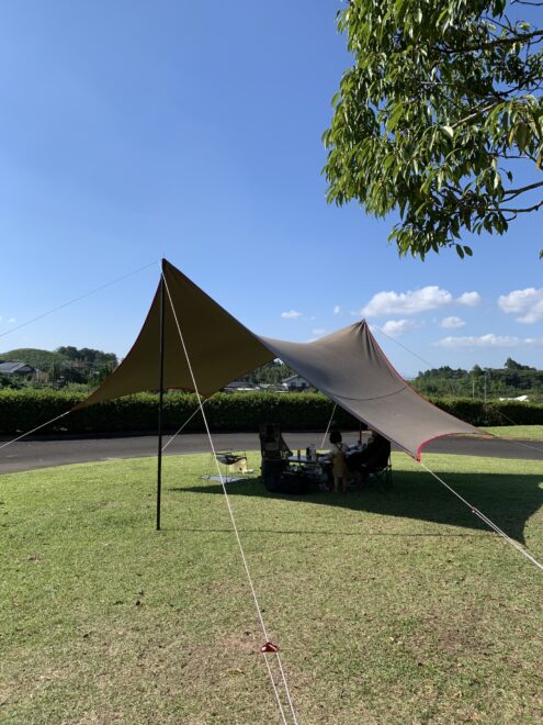タープの良いところは、よくあるポップアップテントのようなものに比べて広く大きな日陰を作ることができることと、ポールの調整により高さや形状もアレンジできることだと思います。