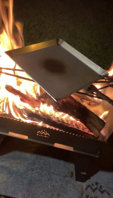 KOKORO FIRE BOXはソロ、デュオにちょうど良いサイズ感で、私の焚き火台の特徴の一つの料理もしやすい構造にもなっています。
