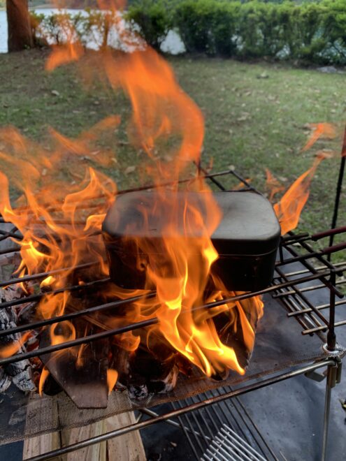 焚き火の火で炊く場合は火力の安定が難しく、風が吹けば火も暴れるため均等に火を当てることが難しくなります。