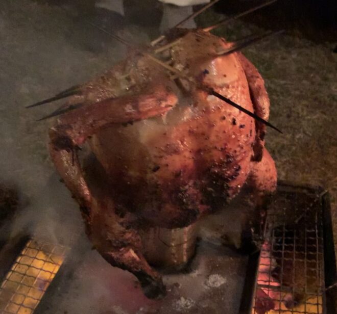 丸鳥を使った料理自体が初体験でしたが、キャンプならではの豪快な丸焼きスタイルで、ボリュームタップリで見た目もインパクト大でとても面白かったです。