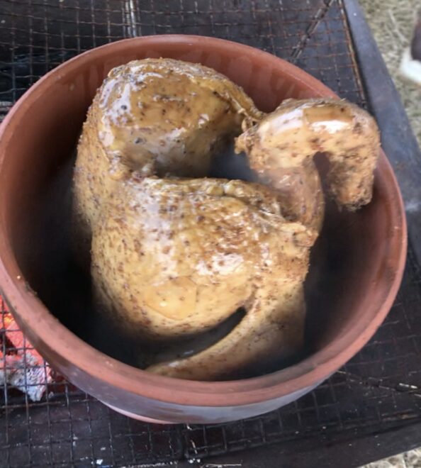 が、ある程度の時間炭火にかけていた時に、熱を持ちすぎた植木鉢の下側がチキンが焼き上がる前に崩壊してしまいました。