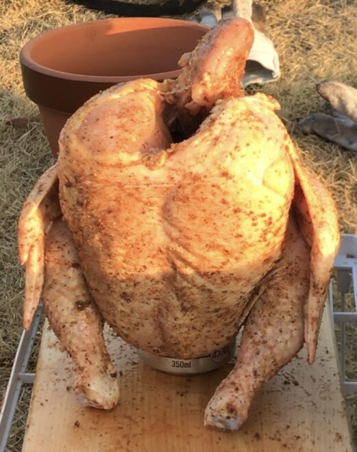 仕込みは缶ビールに丸鳥を立ててスパイスで味付けをして焼くだけ!