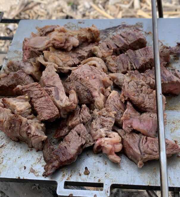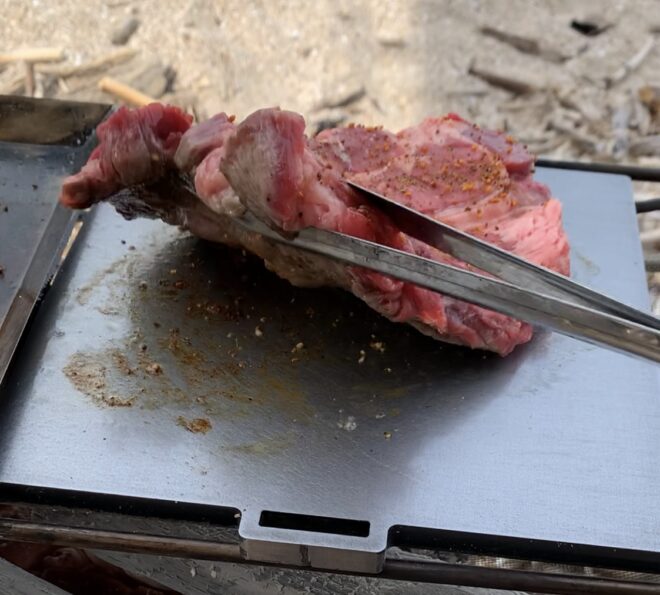今回炭火で鉄板を加熱して肉を焼いてみました。