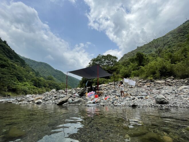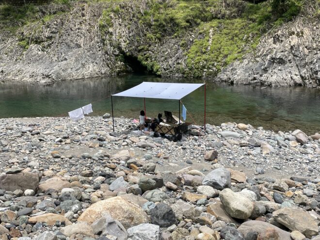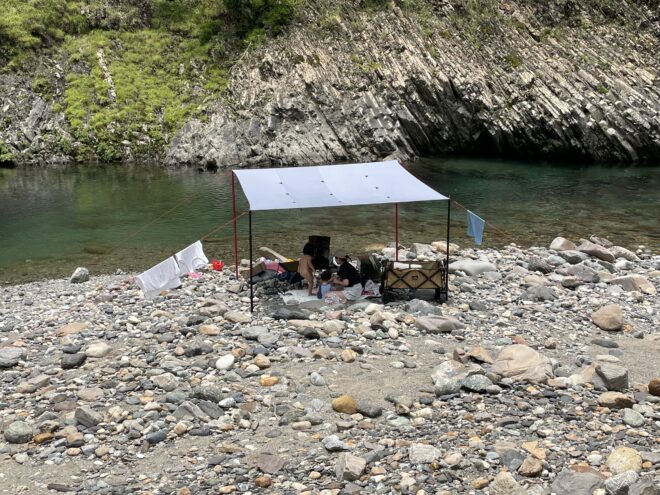 河原ではペグが効きにくいので、大きな石にガイロープを引っ掛けてタープを張ります。