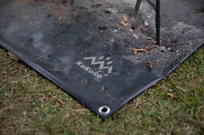 焚き火台を使用するとして、その焚き火台にもよりますが火床に高さが無い焚き火台の場合は、難燃素材の焚き火シート敷いてその上に焚き火台をセットします。