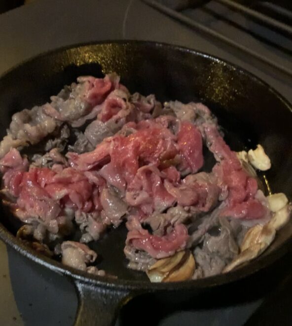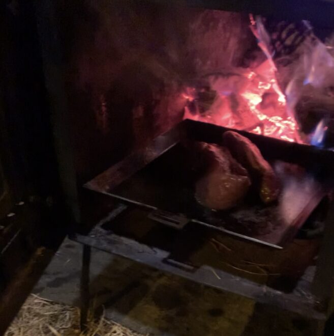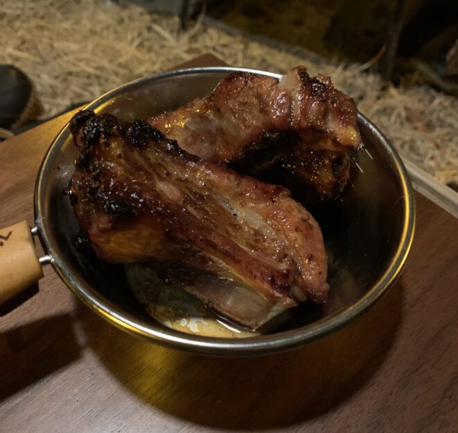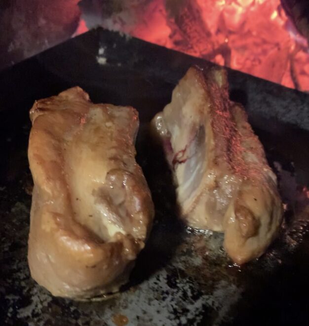 前回のファミリーキャンプの時もスペアリブをスキレットを使って焼きましたが、今回薪ストーブの燃焼室で焼いてみて熱の入り方が全然違う事に驚きました。
