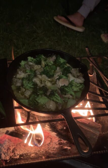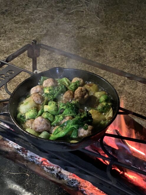それにシズル感もあって、焚き火の炎で豪快に作ることができるのが作っていて楽しいです。