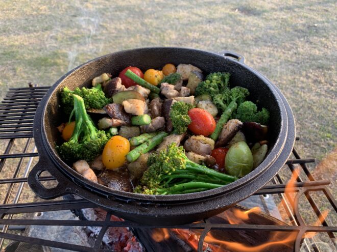 スキレットやダッチオーブンは鋳物のものが多くて、厚みもあるので火加減をそこまで気にせずに豪快に作りやすいところが面白味でもあります。