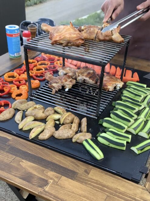 従来のBBQコンロにはない新しいスタイルで、焚き火をしながら鉄板BBQ料理を楽しめるものです。